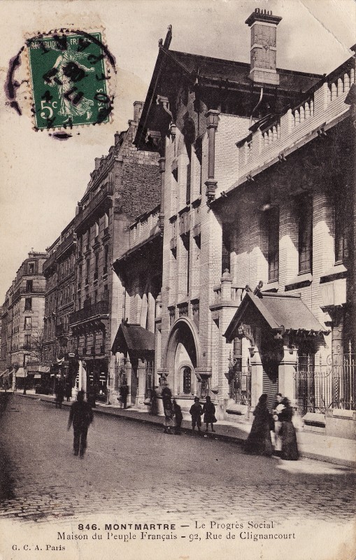 Planquée comme on l’a dit derrière un immeuble, la maison a visiblement été construite en 1901. L’immeuble d’origine a d’abord abrité le siège de l’Association Le Progrès Social, qui animait la Maison du Peuple Français, puis l’École d’Aéronautique comme en témoignent les cartes postales de l’époque, sur lesquelles on reconnaît parfaitement le style de la maison. Reconstruit en 1936, il s’agit depuis d’un immeuble d’habitation, qui aurait abrité l’Association des Chemins de Grande Randonnée, l’Association des Portugais de Paris, puis un atelier de tapisserie, Michel-Antoine ayant retrouvé une enseigne dans le grenier.