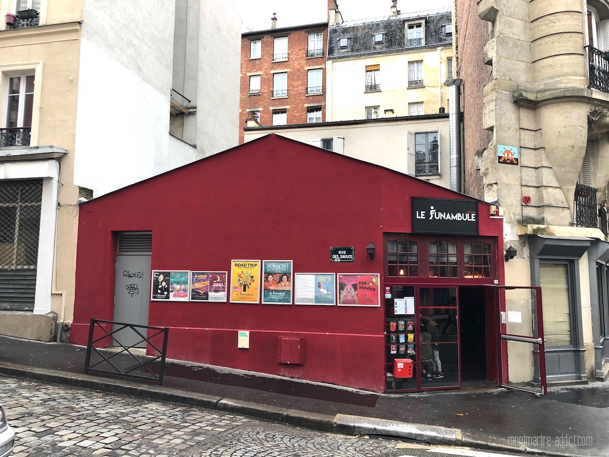 Les théâtres ont toujours été nombreux à Montmartre, et le quartier compte encore plusieurs salles qui font ses belles soirées. Le Funambule fait partie des plus récents, mais également des plus vivants, et si vous descendez la rue des Saules depuis la rue Caulaincourt, vous remarquerez forcément sa façade rouge, juste avant l’immeuble en angle de la rue Francoeur.