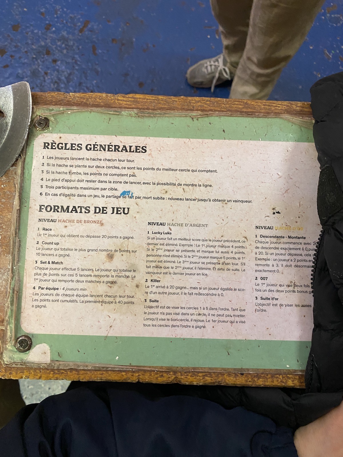 Une fois la technique du lancer maîtrisée, Les Cognées proposent de s’essayer à différents challenges selon le niveau des joueurs, et d’organiser des tournois entre équipes. Chaque session dure une heure et le nombre de participants maximum par cible est de trois. Il est également possible de privatiser la salle et le bar qui fait office de guinguette pour requinquer les bûcherons en herbe avec une petite carte de sodas, Red Bull, bière légères, pâté basque, chichon de canard et saucisson. À la bonne franquette !