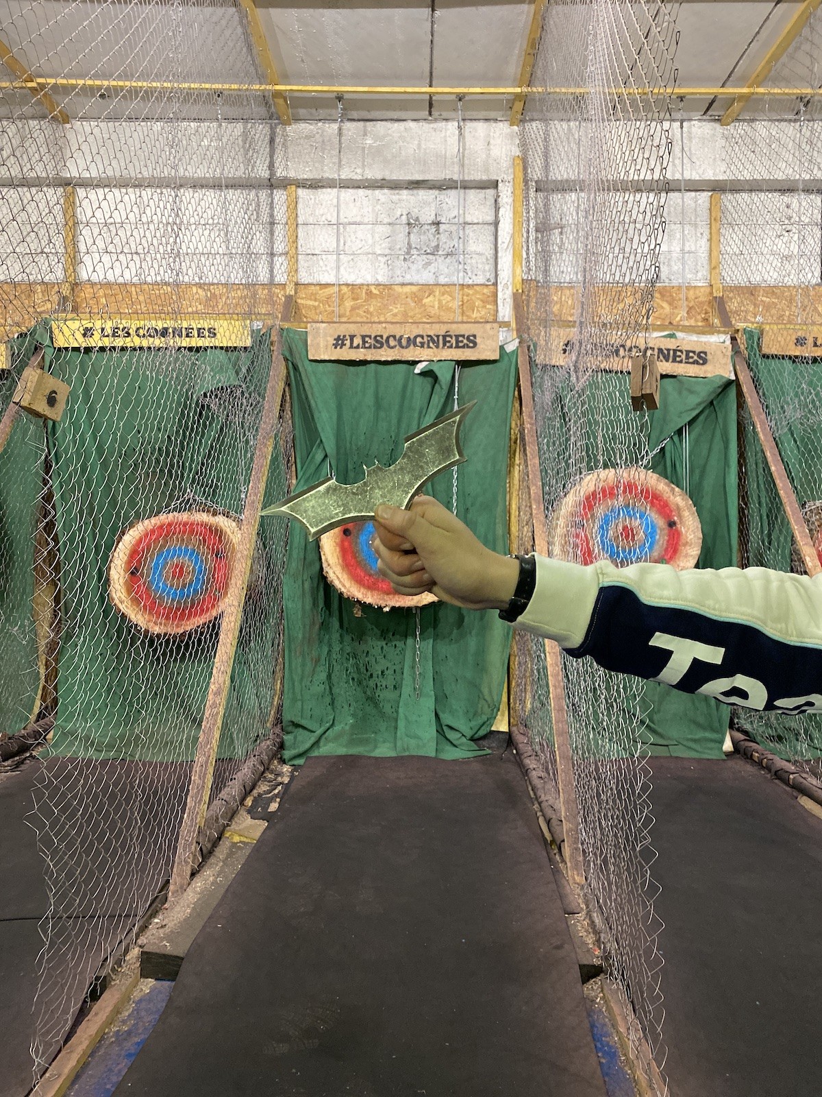 Les armes sont façonnées par un métallurgiste en Normandie qui décline l’attirail de combat sous plusieurs modèles : haches, hachettes, shuriken et le batarang, réplique exacte du couteau de lancer de Batman en forme de chauve-souris. Ne prenez pas peur, les lames sont élimées pour ne pas se couper et les blessures sont les plus fréquentes sont celles provoquées par les échardes du bois. D’ailleurs, les dix cibles en bois de peuplier pèsent chacune 300 kilos, sont changées tous les six mois et proviennent d’une scierie dans le 77.