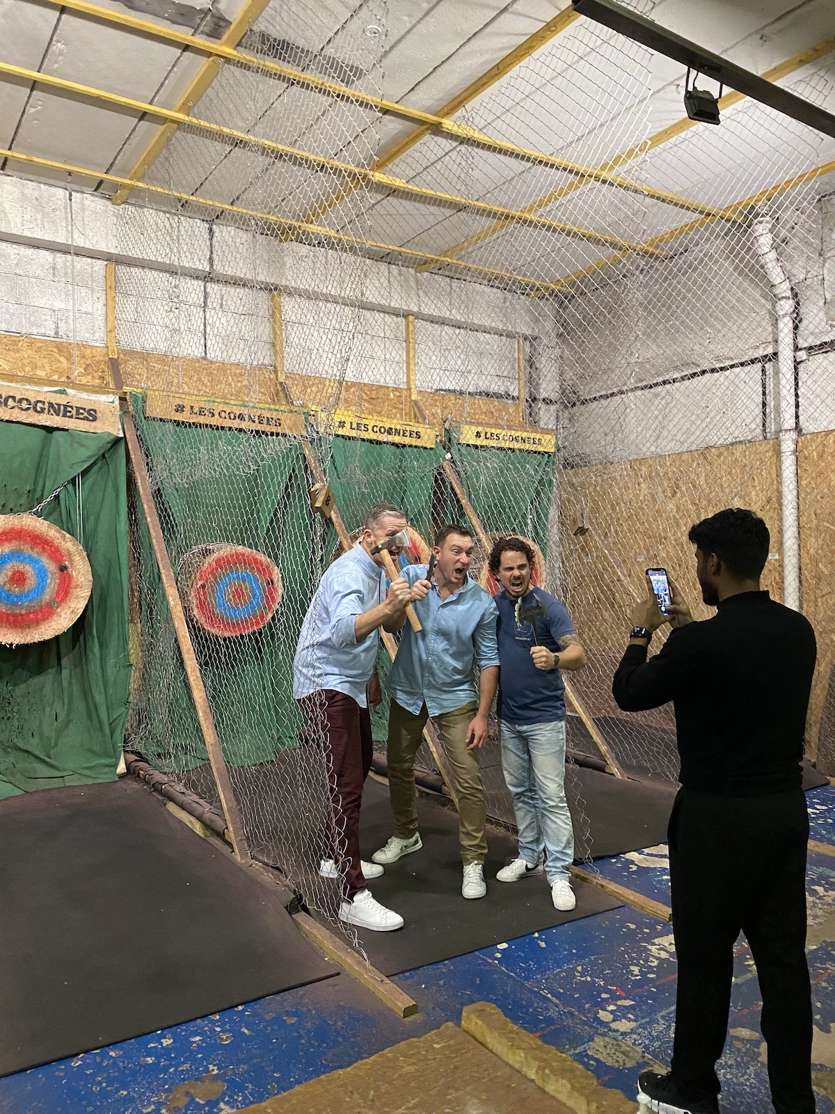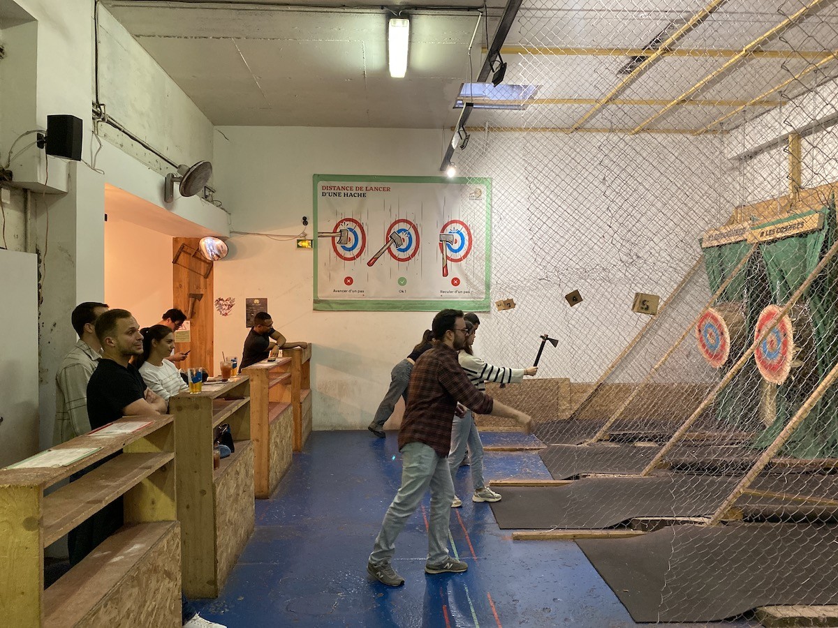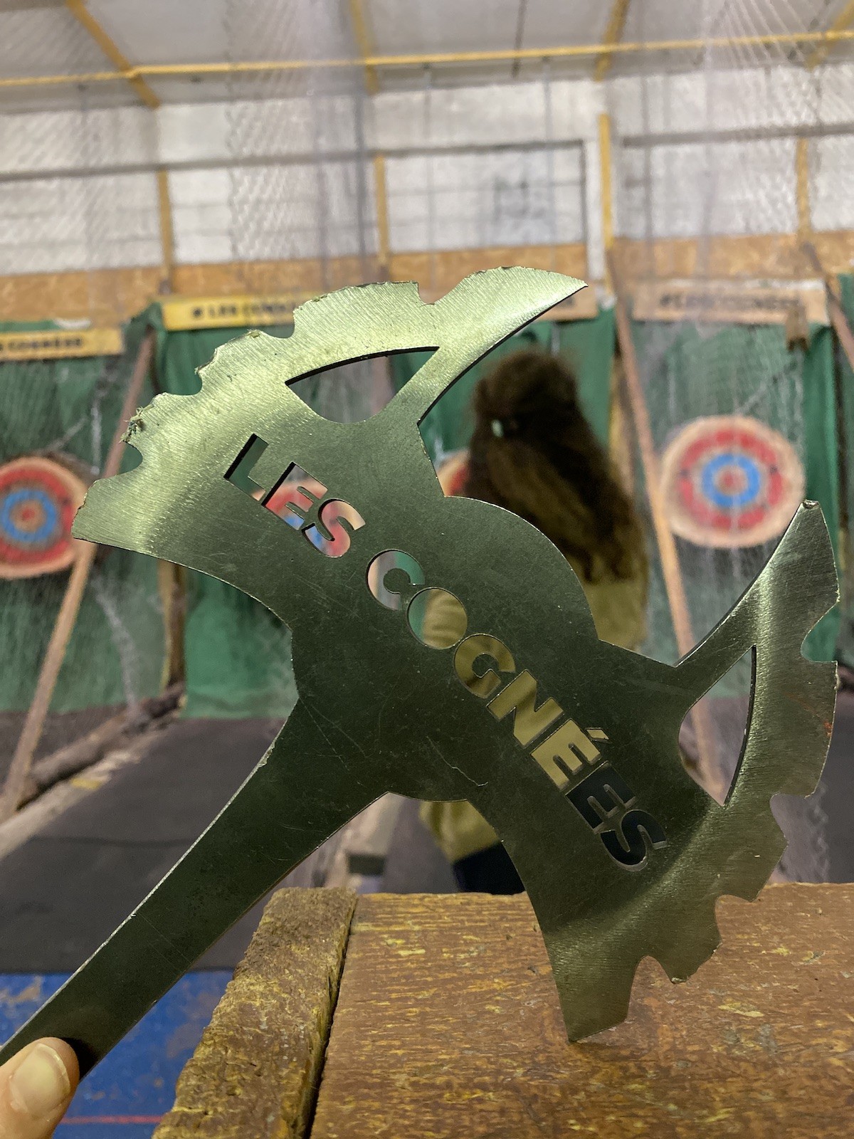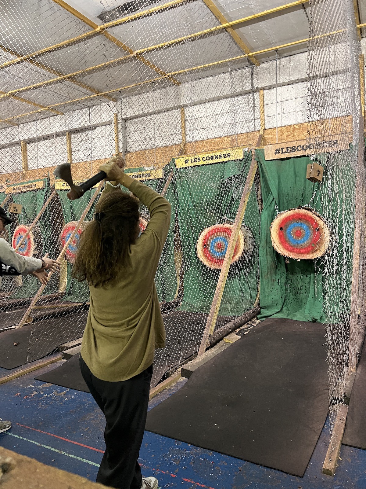 Mais en quoi ça consiste exactement le lancer de haches ? Pour résumer, c’est un peu comme le tir à l’arc, mais en plus barbare nous explique Alexandre, qui s’occupe de la communication du lieu. L’activité se pratique seul ou à plusieurs, en couple, entre amis et parfois même pour des premiers « dates ». Très populaires également auprès des « bride » et « groom to be » embarqués à leurs risques et périls pour un EVJF ou un EVG, Les Cognées sont également assez prisées pour les formats team buildings. Loin de là l’idée de régler ses comptes entre collègues ou de faire un remake d’American Psycho, mais plutôt de sortir des sentiers battus en apprenant à lâcher prise. Pour s’être nous-même laissé tenter, balancer une hache à plus de 5 mètres devant soi n’est pas un exercice facile, c’est avant tout un jeu d’adresse. Sur les conseils avisés des instructeurs et après un brief des consignes de sécurité, on découvre les règles du jeu, on apprend à se positionner à la bonne distance, à tendre ses bras correctement et à ajuster sa force de frappe. Quelques (nombreux) essais plus tard, notre persévérance paye : notre premier projectile est planté au beau milieu de la cible. Et on doit l’avouer, c’est méga satisfaisant.
