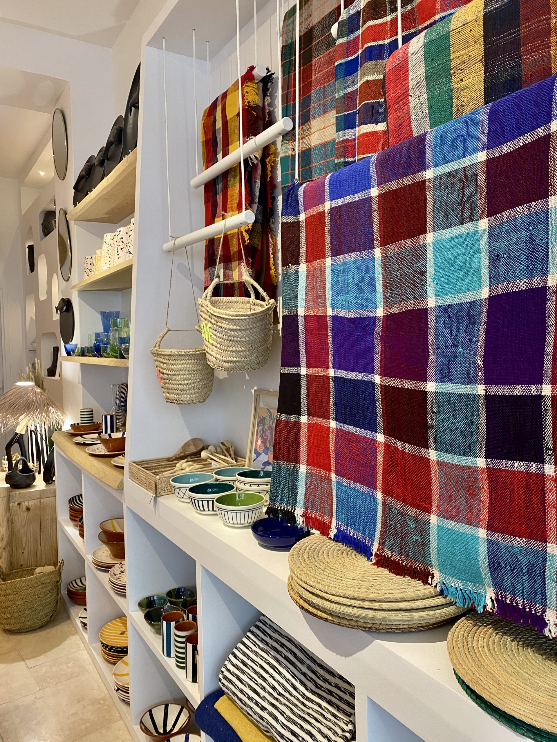 Dans la boutique, chaque pièce est mise en lumière par la très jolie collaboration avec Charlotte Vinet, architecte d’intérieur qui habite elle aussi, dans le quartier. Les niches accueillent des verreries soufflées-bouche, des vases aux courbes terracotta, de la vaisselle Casa Cubista, des lampes en raphia, des rideaux à pompons et des foutas… Mais aussi du petit mobilier comme les tabourets Beldi tissés avec du bois de citronnier et des commodes en madrier. Le style est ethnique, chic, on pourrait même dire bohème, pour mieux réchauffer les cœurs et habiller les intérieurs. Pour apporter plus de sens à la manière de consommer, Darine et Kévin passent par l’échange. Ils nous détaillent la différence entre la laine épaisse d’un tapis Beni Ouarain et les motifs géométriques colorés de sa version tunisienne. Nous font découvrir des poteries modelées par les femmes de Sejnane en Tunisie, dont la technique ancestrale se transmet de mères en filles ; et est aujourd’hui reconnue patrimoine immatériel de l’humanité par l’UNESCO.